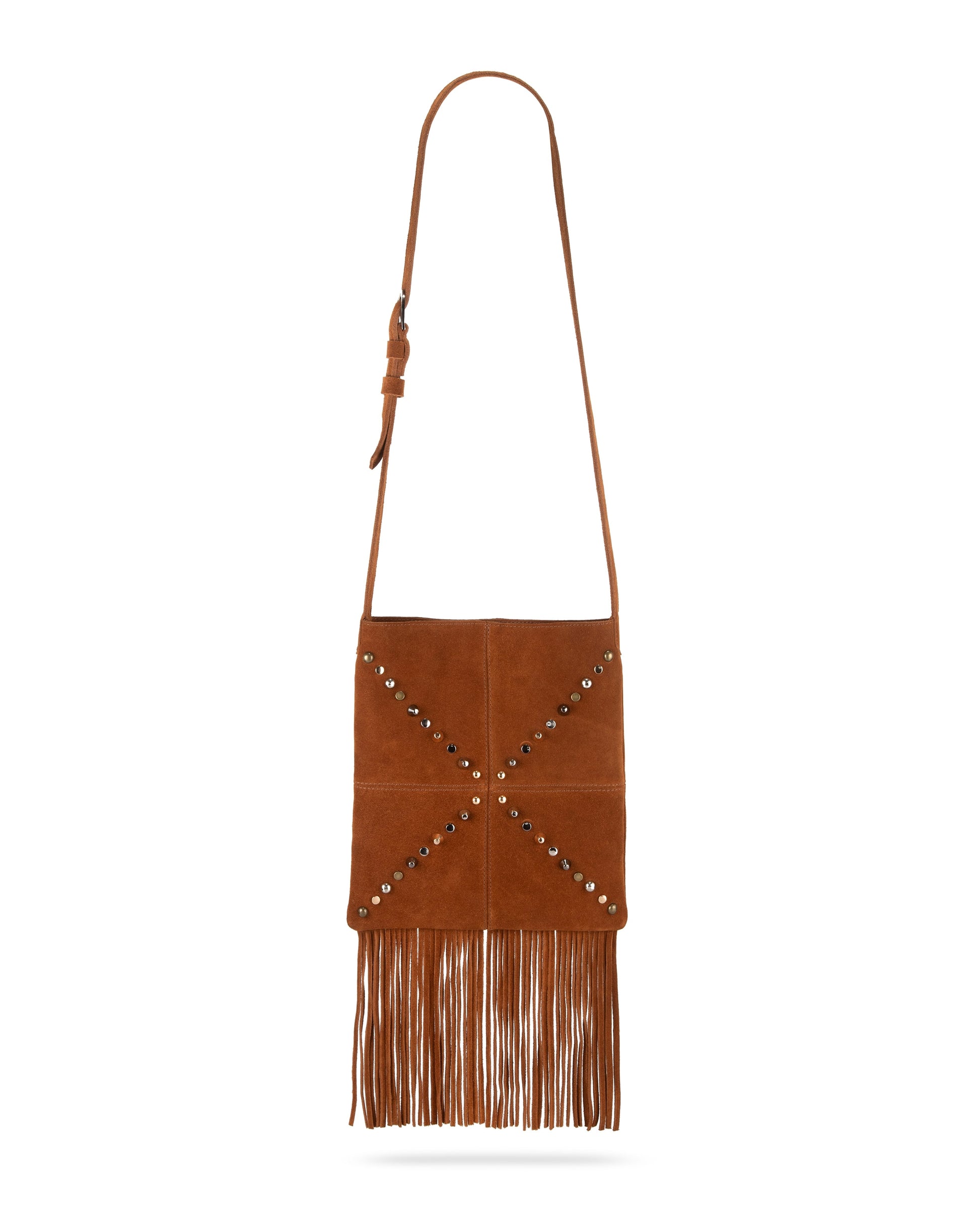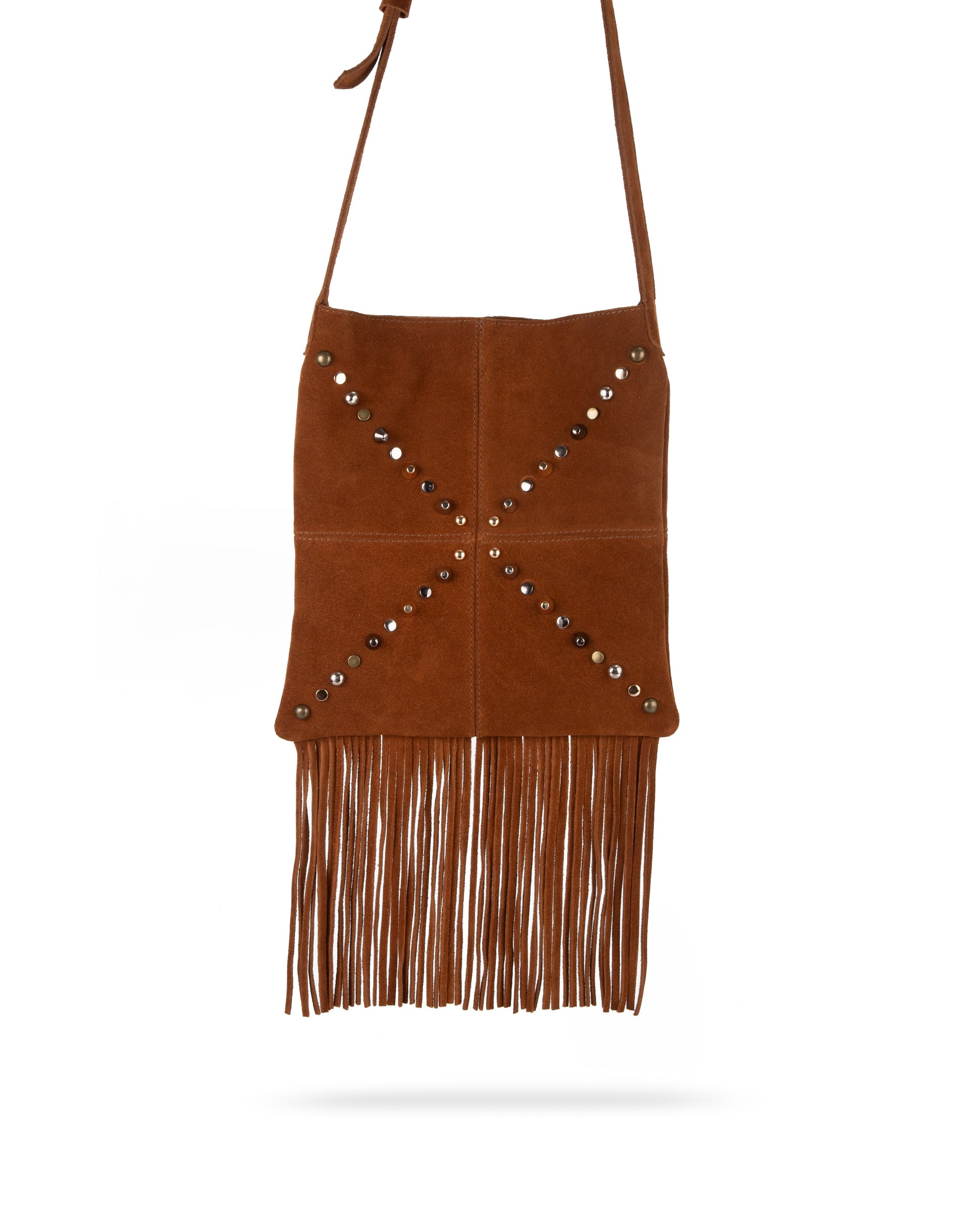 Bolsa cruzada de gamuza con flecos y remaches – Piel genuina hecha a mano.