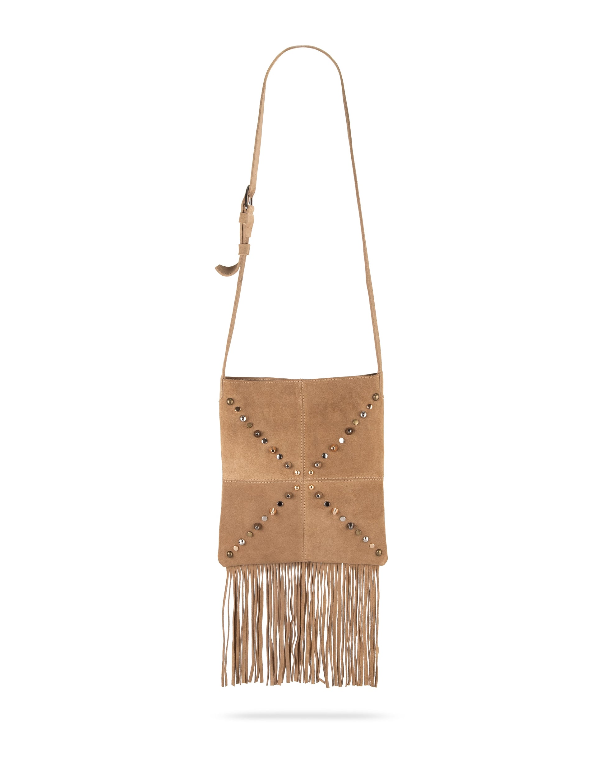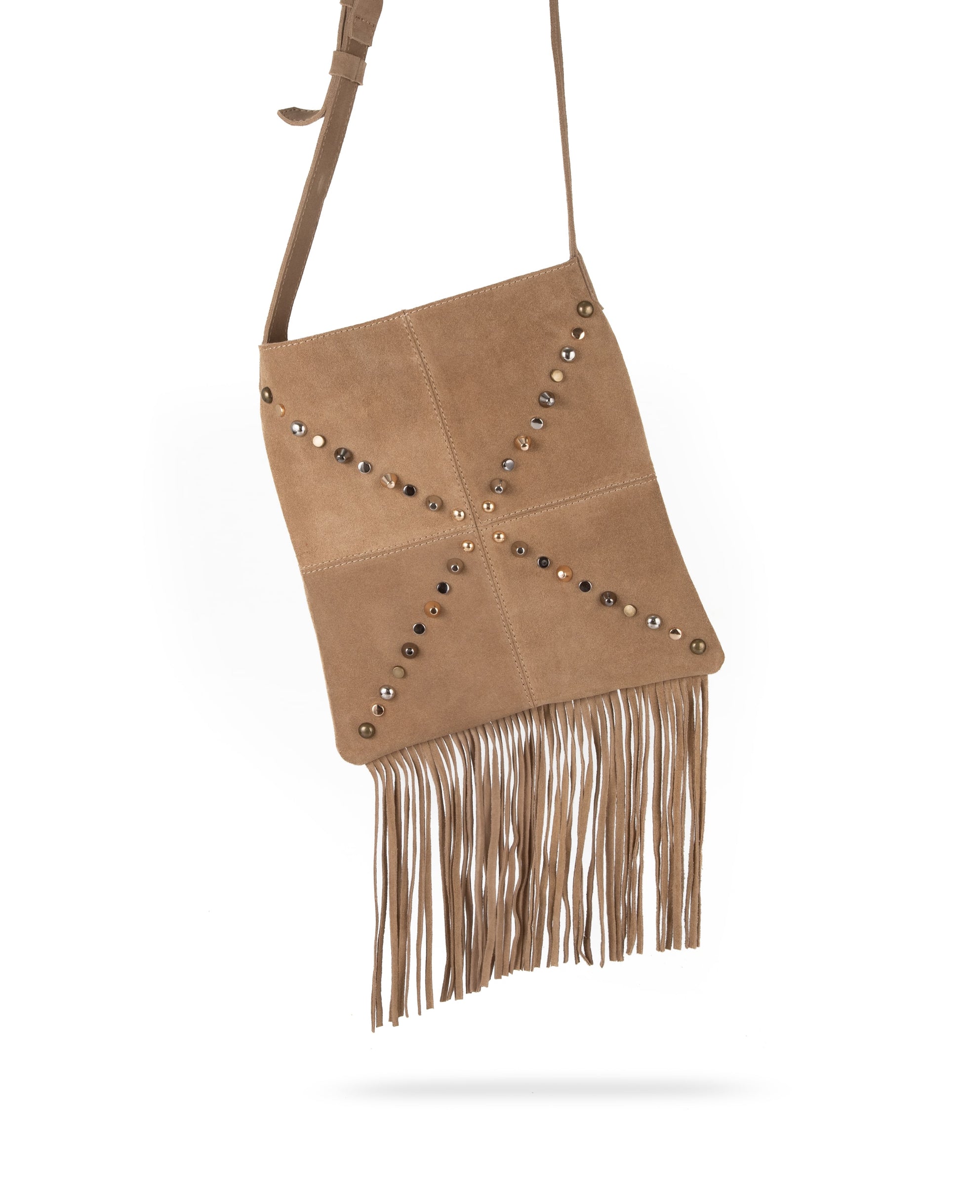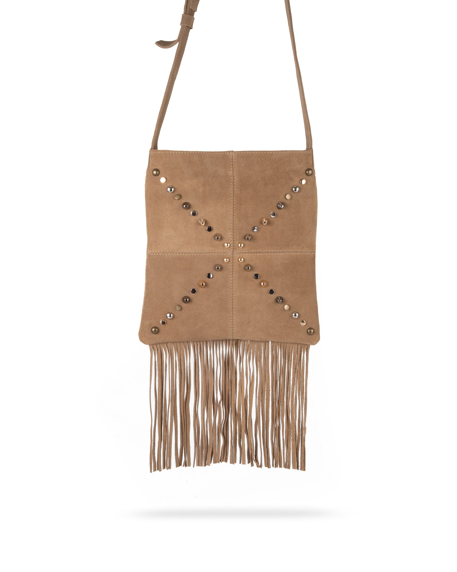 Bolsa cruzada de gamuza con flecos y remaches – Piel genuina hecha a mano.